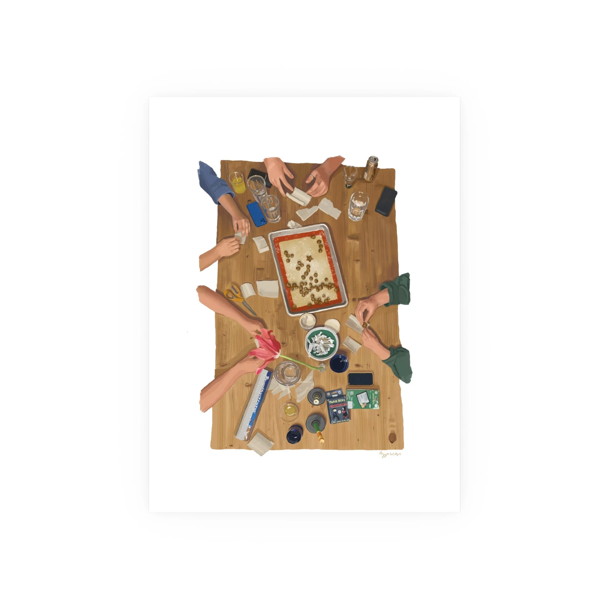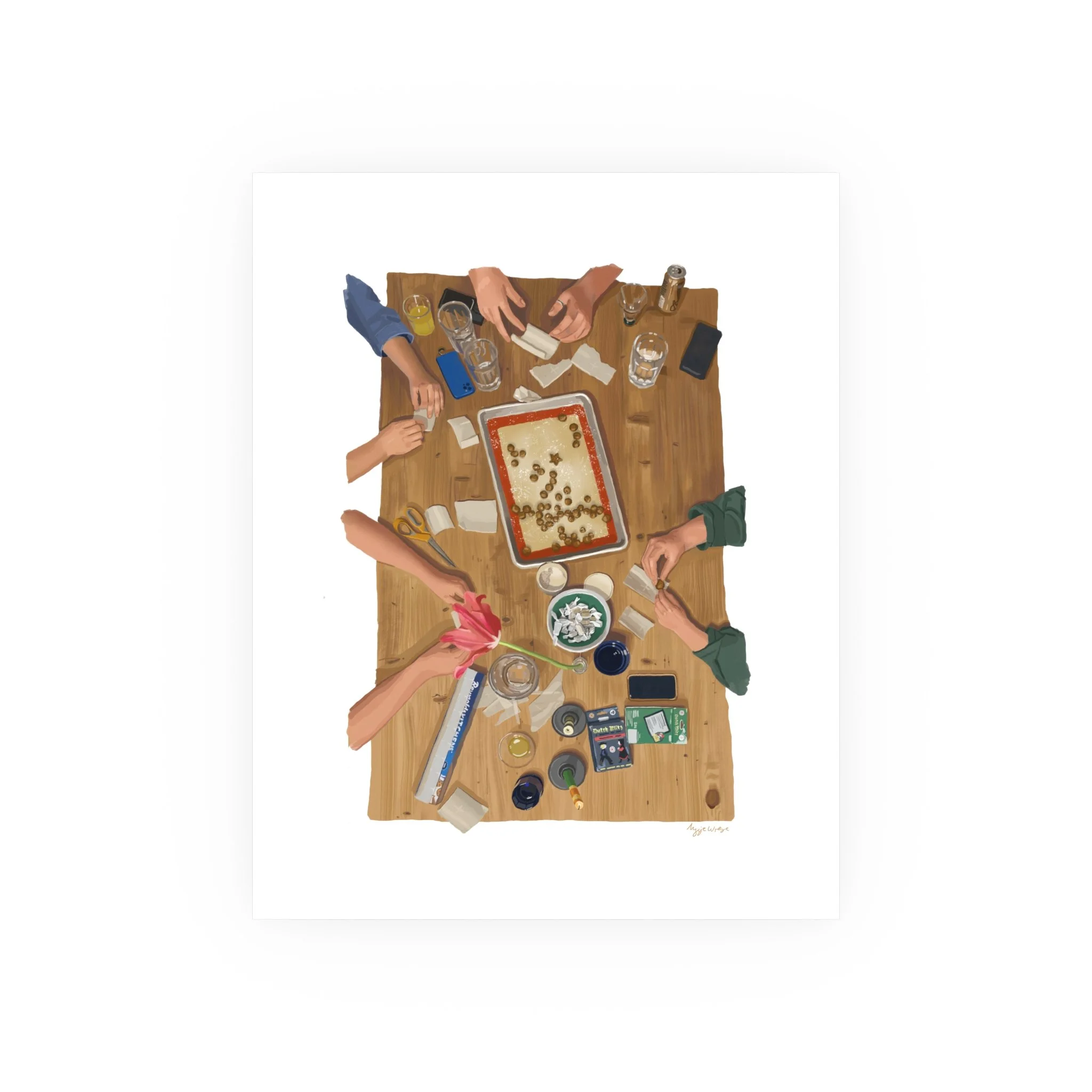 Print of a digital illustration of caramel wrapping, with Grant, Erin, Asha, Yeager, Jules, Emily, and Taylor <3